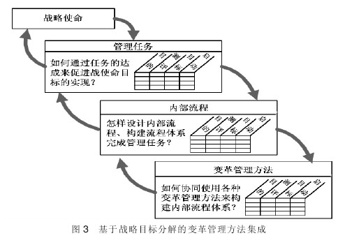 因此,流程不仅对组织任务的实现起着关键的支撑作用,而且是驱动战略实现的基础。依据这一逻辑关系,应逐步把战略落实到任务与流程上来,并通过变革管理方法的协同使用,实现战略目标(如图3)。